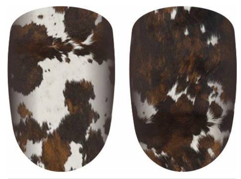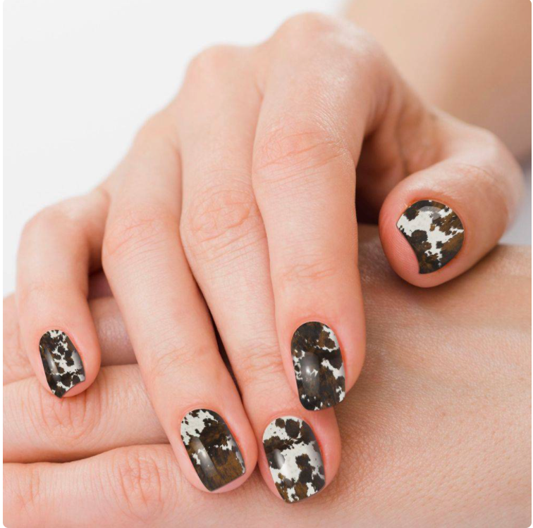 Cattle Drive 16-piece real nail polish strips. These nails feature a black, white and brown cowhide design.