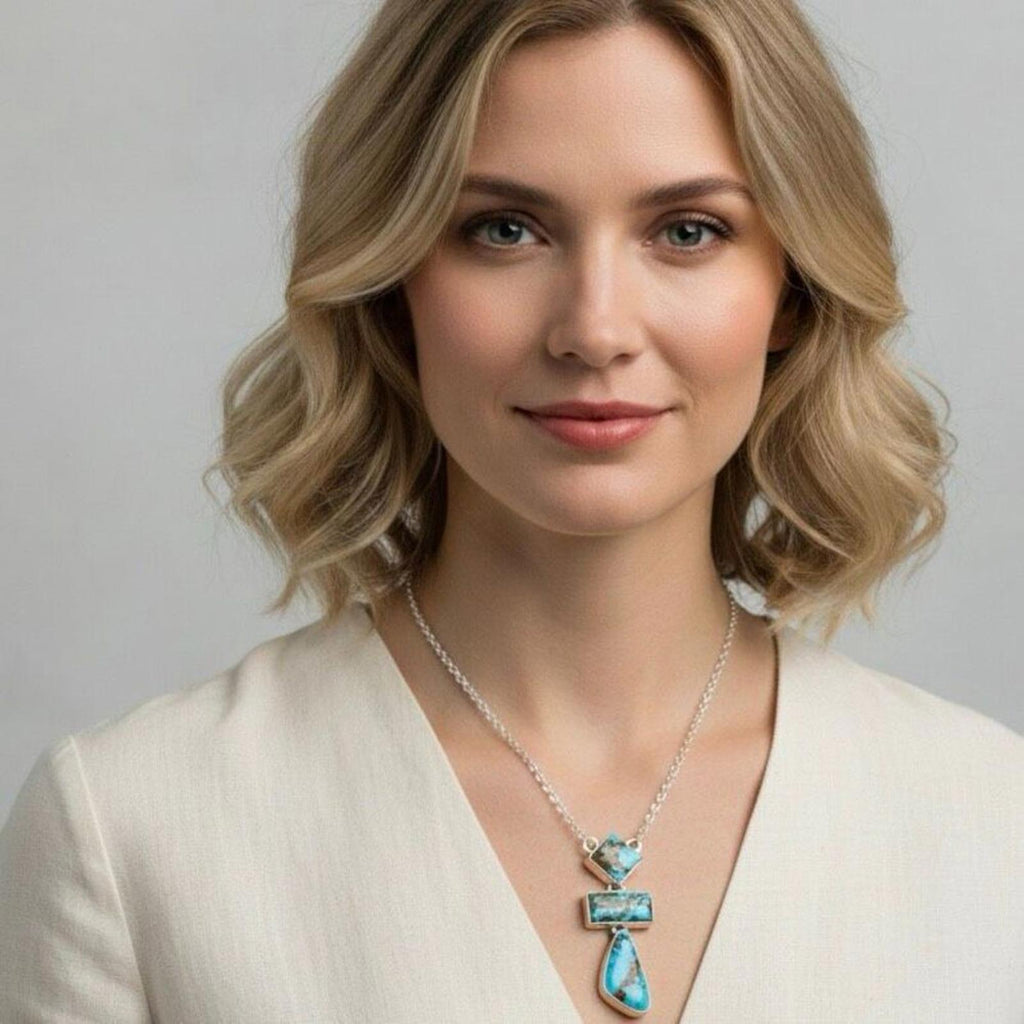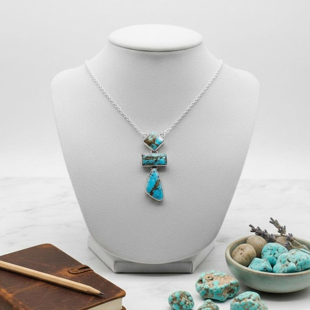 Elevate your collection with this exquisite Handcrafted Golden Hills Turquoise & Sterling Silver Necklace. This piece features three distinct, high-grade stones sourced from the famous Golden Hills mine in Kazakhstan, known for its rare "Lavender" or periwinkle blue coloration and contrasting burnt-umber matrix.