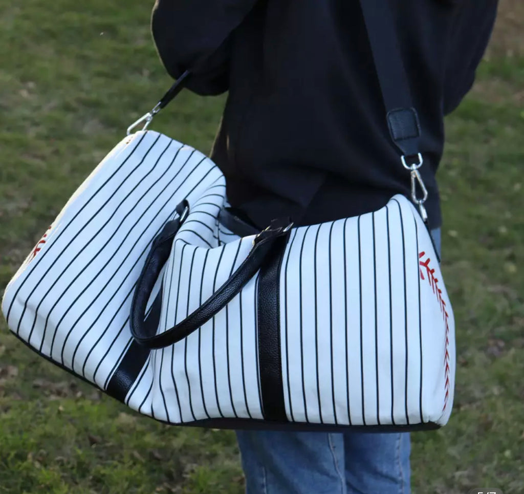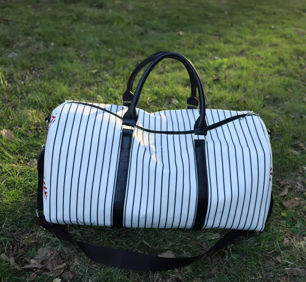 Made from canvas material. Duffel bag measures approx.: 14”x21”. Perfect size to take to a camping trip, gym, road trip, dance class, beach etc.
