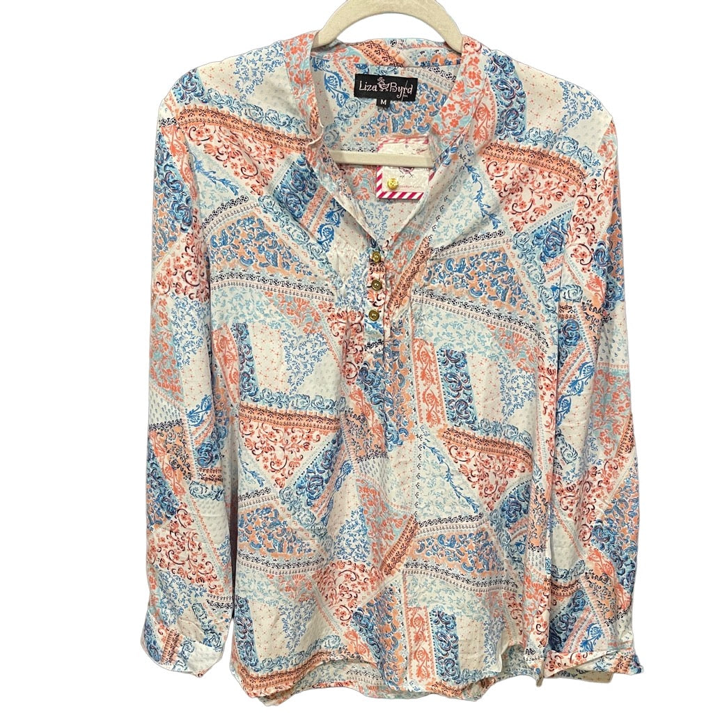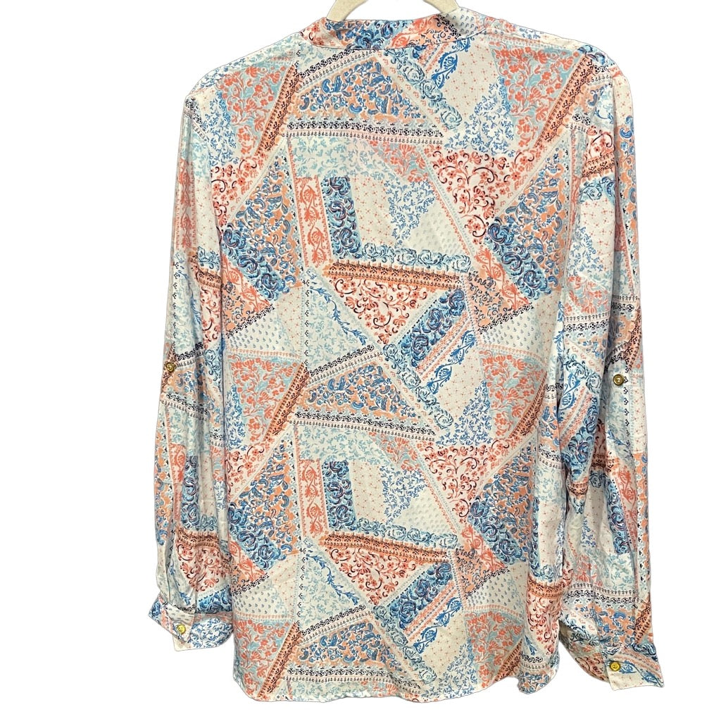 Liza Byrd Womens Floral Heart Patchwork Design Long Roll Tab Sleeved Blouse M