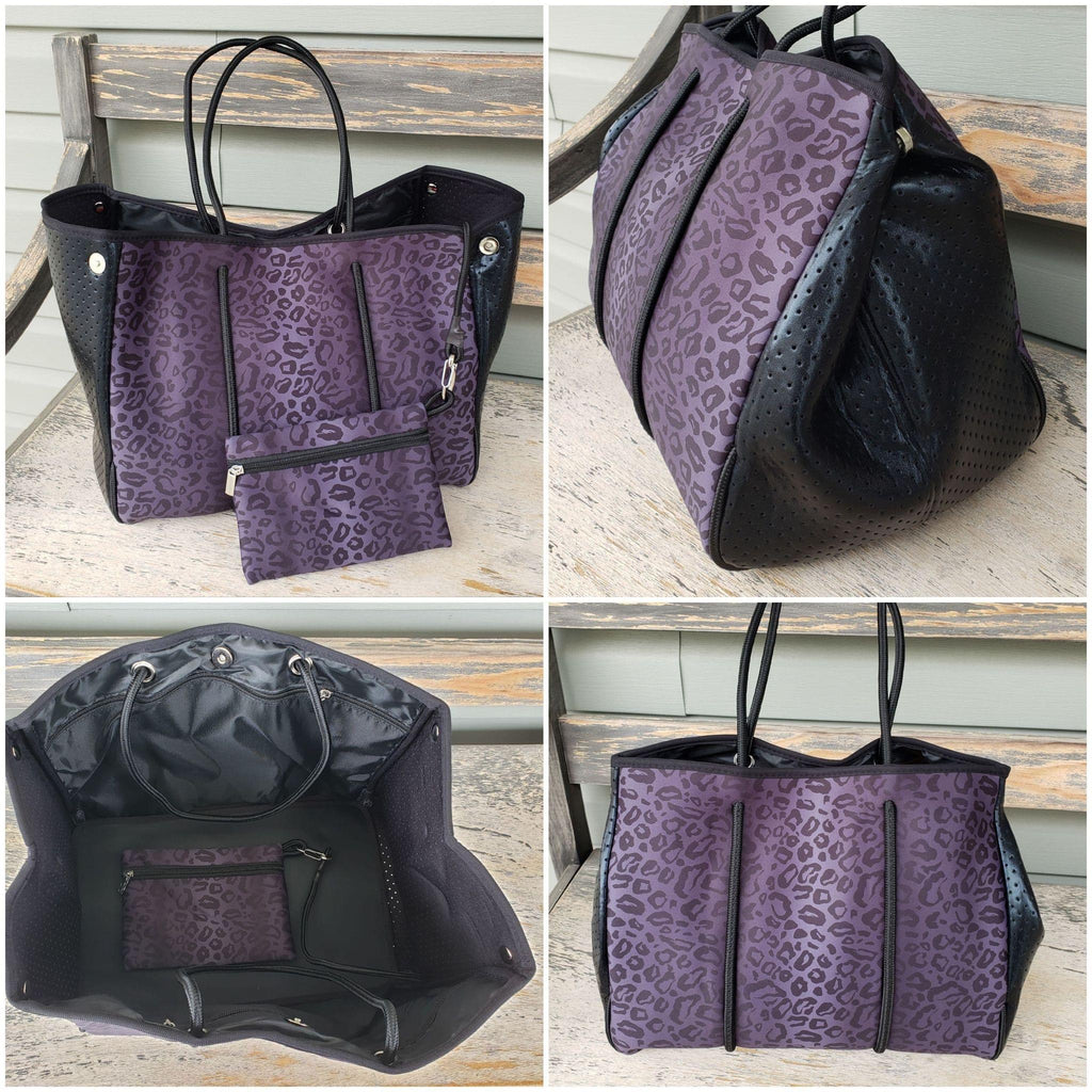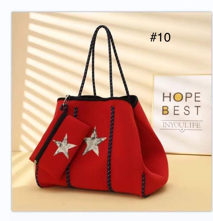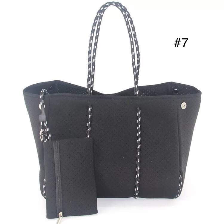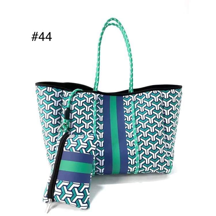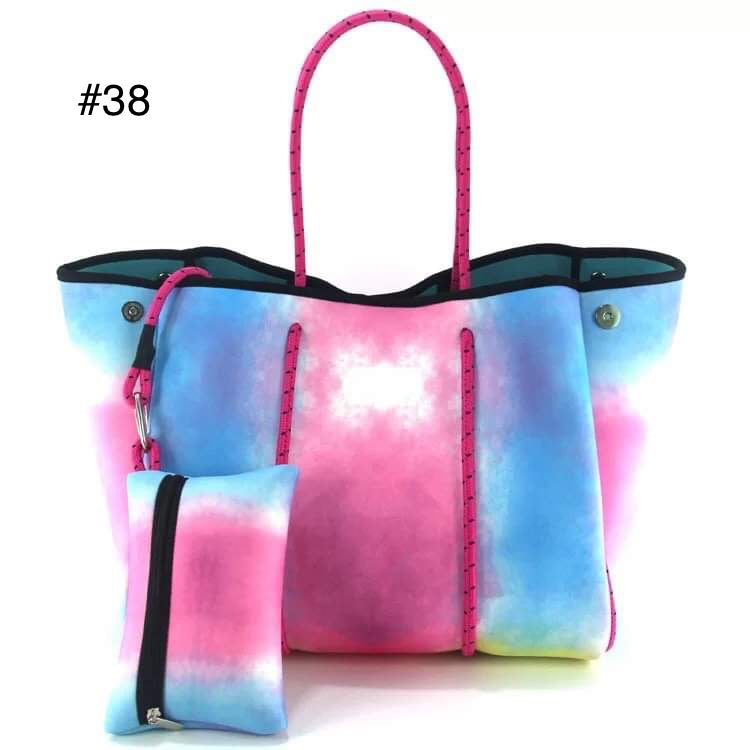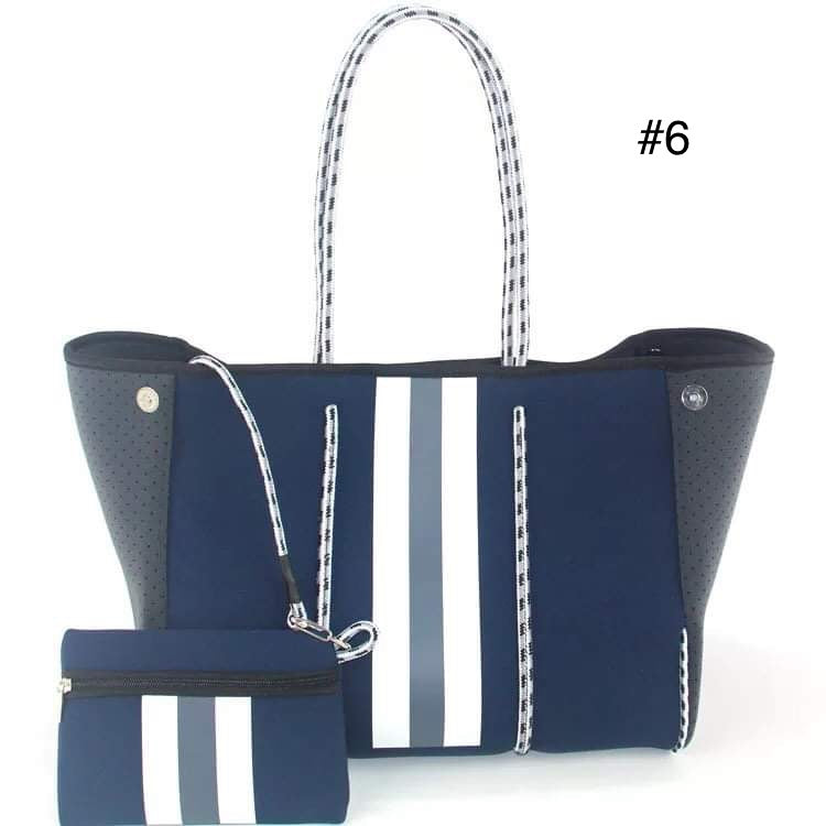New neoprene waterproof tote bag. Lined interior with zipper pocket. This bag has comes with removable neoprene wristlet pouch.