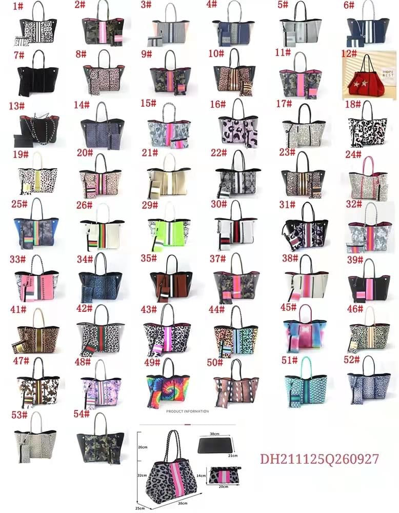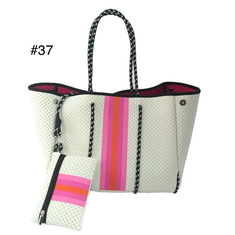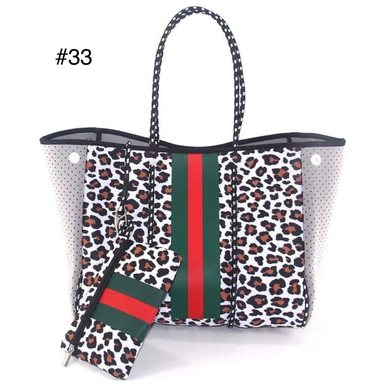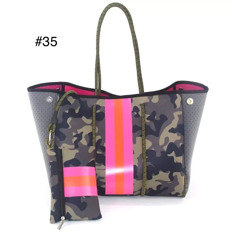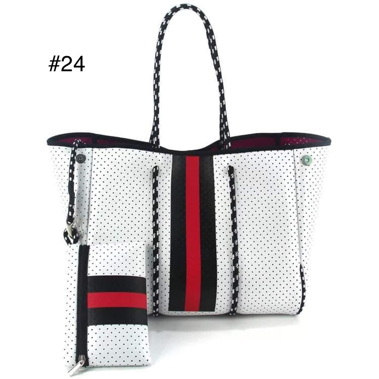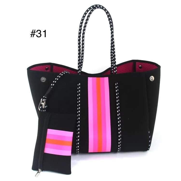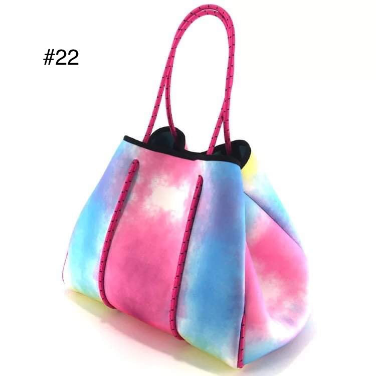 New neoprene waterproof tote bag. Lined interior with zipper pocket. This bag has comes with removable neoprene wristlet pouch.