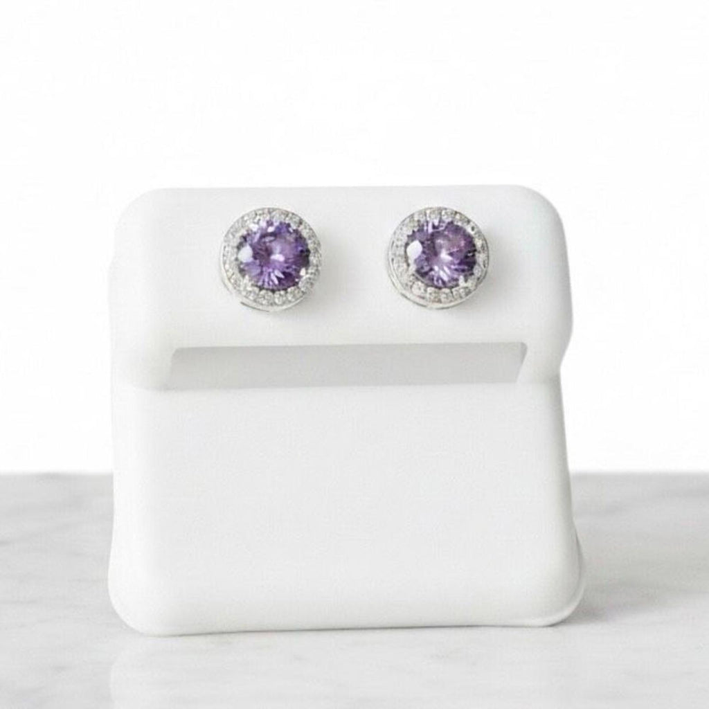 New Amethyst CZ Halo Stud Earrings • 925 Sterling Silver • Round Brilliant Cut