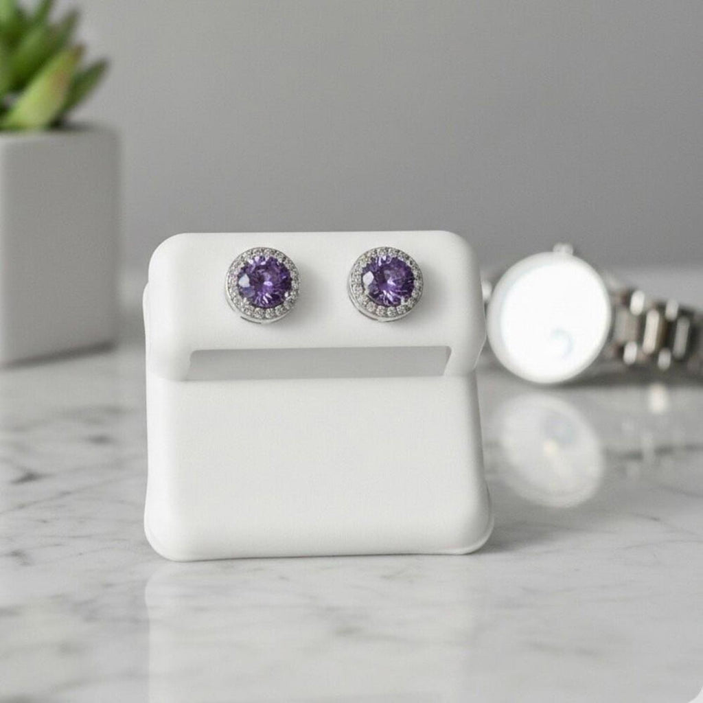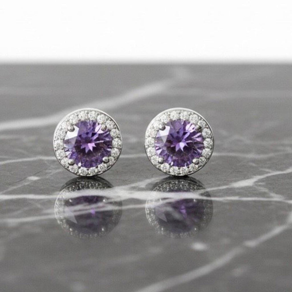 Elevate your everyday sparkle with these stunning Amethyst Cubic Zirconia halo studs. Crafted with high-quality 925 Sterling Silver, these earrings feature a vibrant, round-cut purple CZ center stone surrounded by a shimmering border of clear micro-CZ stones. The classic halo design provides a high-end look that mimics genuine fine jewelry, making them perfect for both daily wear and special occasions.