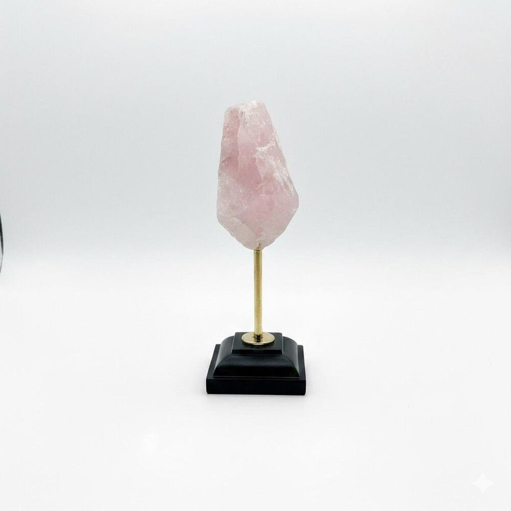 Raw Rose Quartz Crystal Specimen with Gold Tone & Black Pedestal Display Stand