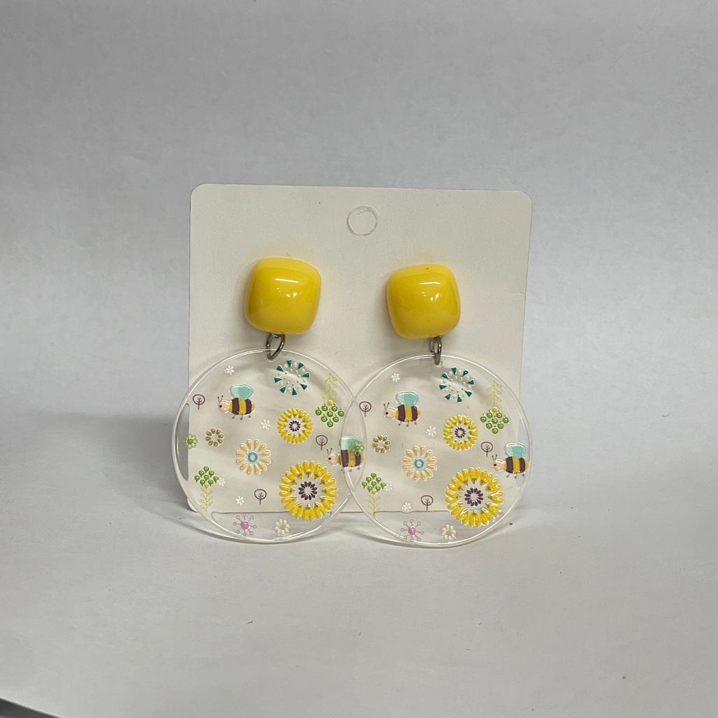 - Womens Boho Korean Designed Oil Painted Bee And Flower Acrylic Disc Dangle Earring