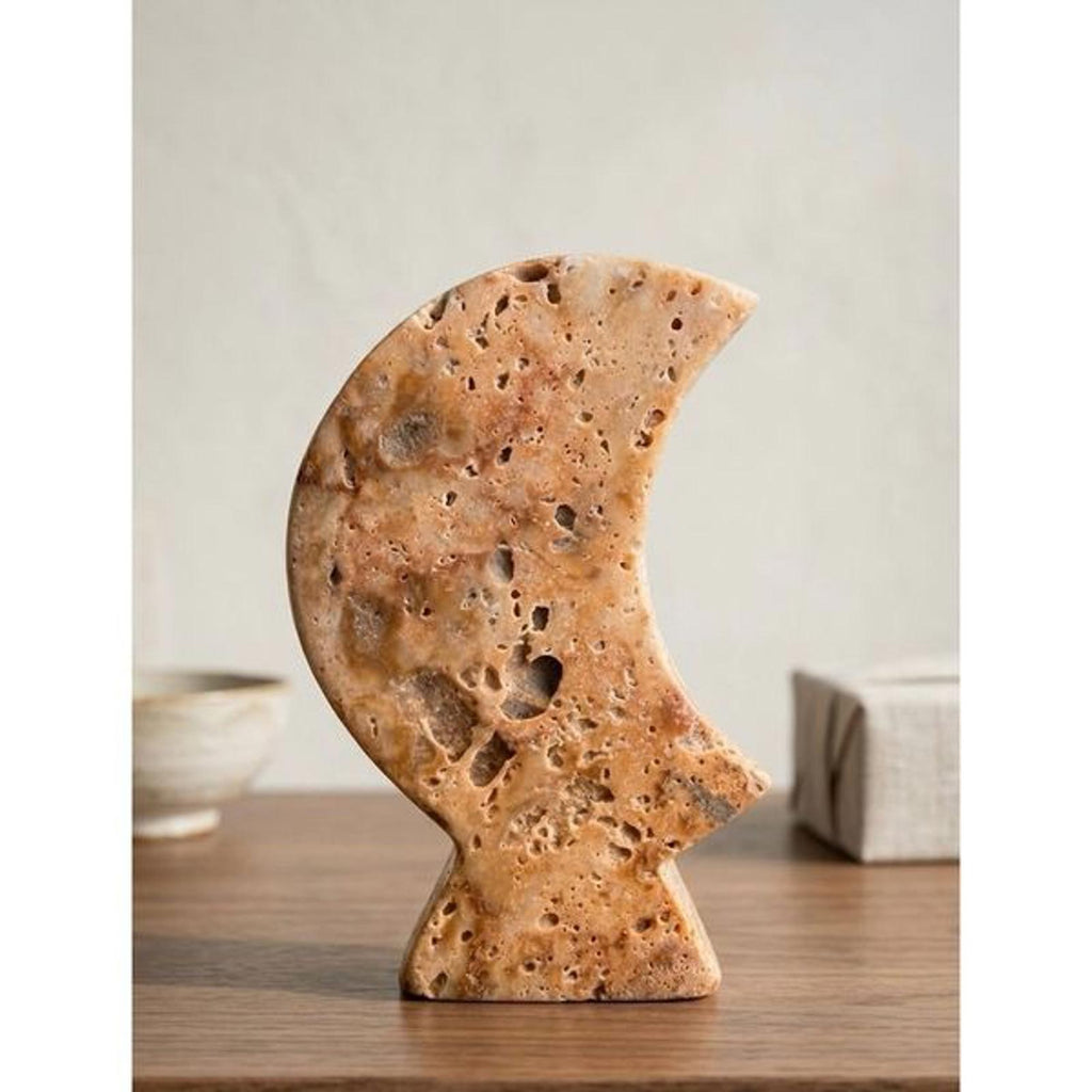 Elevate your shelf styling with this unique Travertine Moon Form. Carved from a single block of natural stone, this piece features incredible natural textures and deep "vug" pockets that catch the light beautifully.